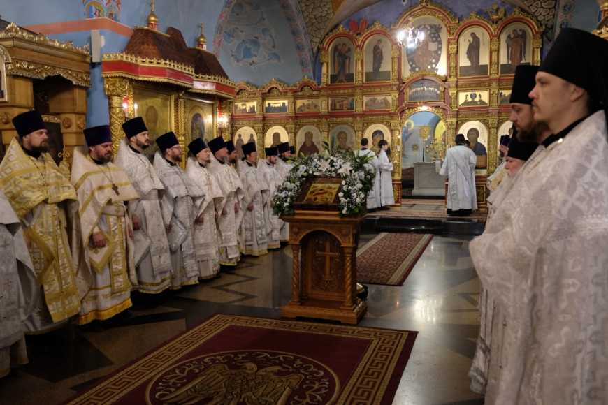 Архипастырю сослужили митрофорный протоиерей Виктор Гнатенко, митрофорный протоиерей Михаил Пристая, игумен Петр (Барбашов), ключарь собора, действительный член ИППО протоиерей Дионисий Фокин, духовенство епархии.