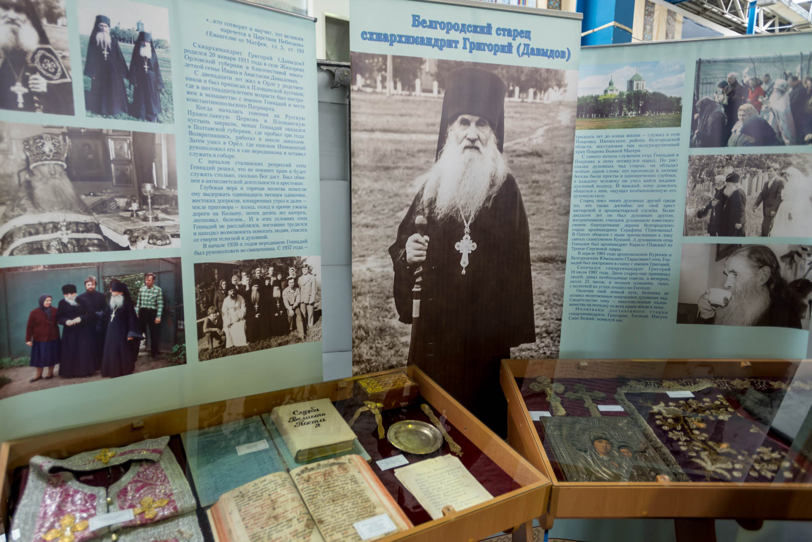 Посетители выставки смогли поклониться ковчегам с мощами белгородских святителей Иоасафа и Никодима, частицам мощей преподобного Сергия Радонежского и великомученицы Варвары, а также чудотворным списком Тихвинской иконы, доставленным из Свято-Тихвинского Борисовского монастыря. Особое место на выставке посвящено жизни и трудам белгородских старцев — отца Григория (Давыдова) и отца Серафима (Тяпочкина). Их личные вещи и архивные фотографии были расположены внутри корабля — центра выставки, символизирующего Святое Белогорье.