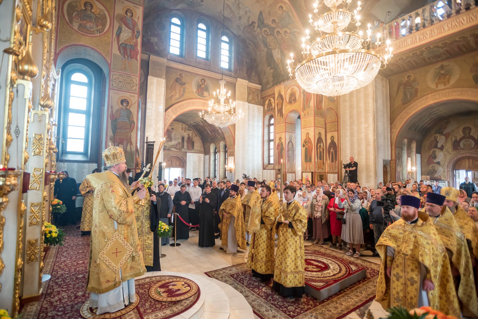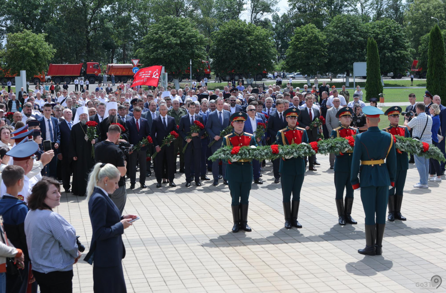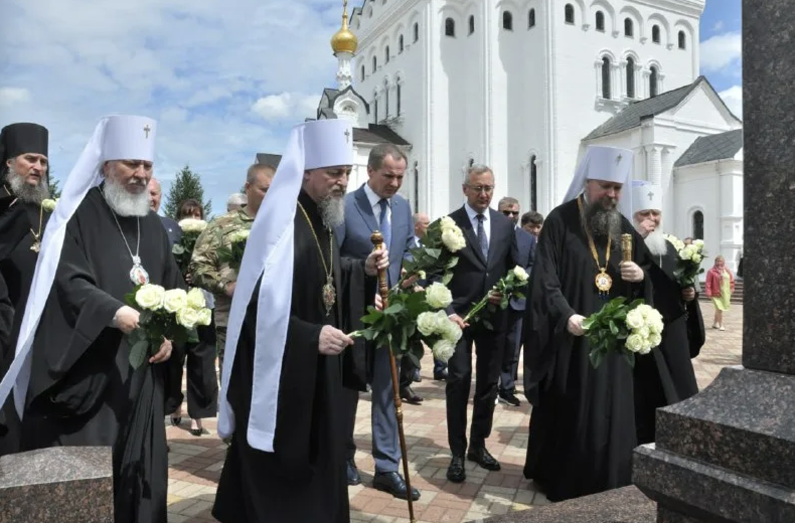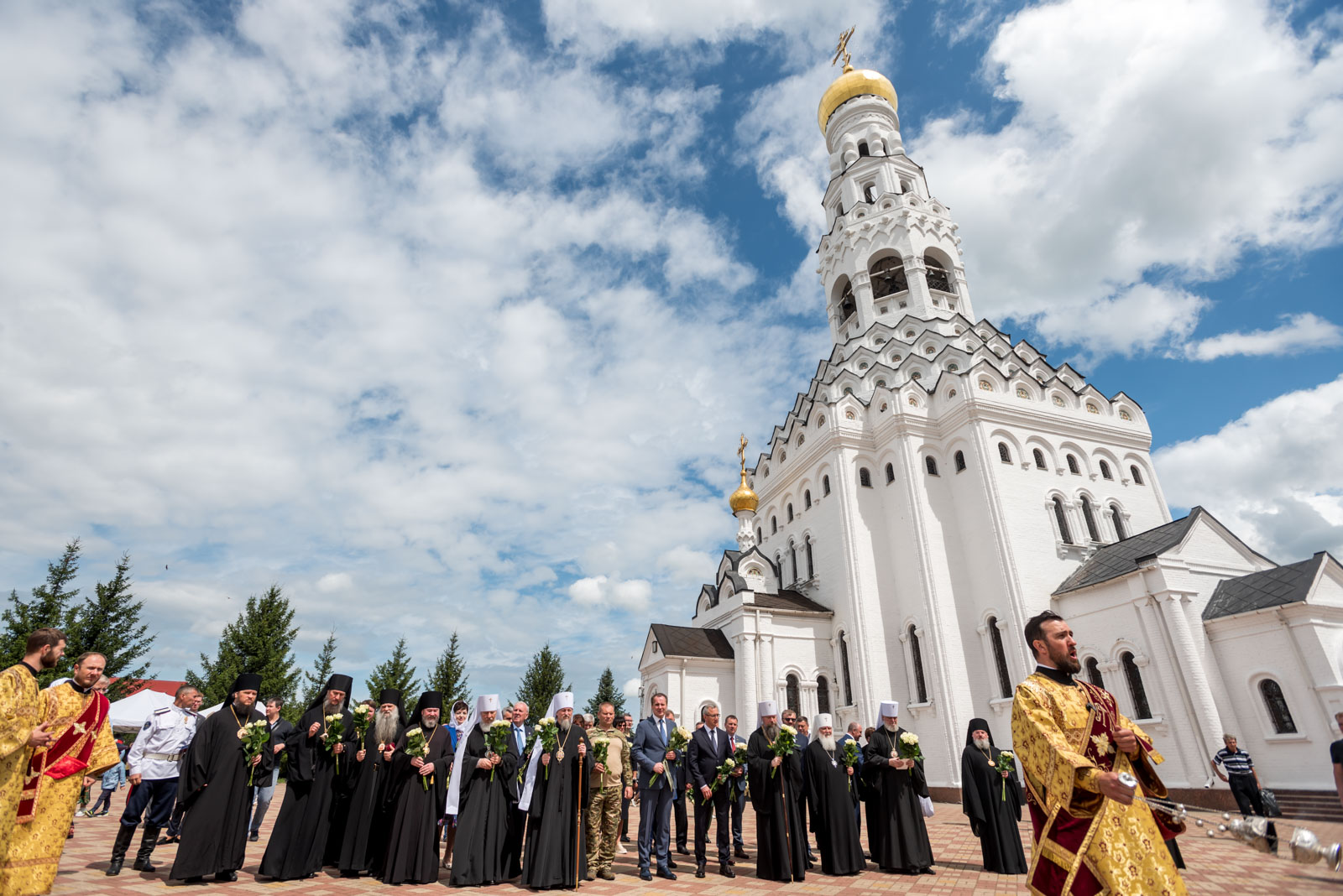 Знаковый день начался с божественной литургии в храме святых первоверховных апостолов Петра и Павла. Это священное место – ещё и памятник погибшим воинам на прохоровской земле. Здесь, на беломраморных плитах высечены имена и фамилии около семи тысяч солдат, павших в боях под Прохоровкой.