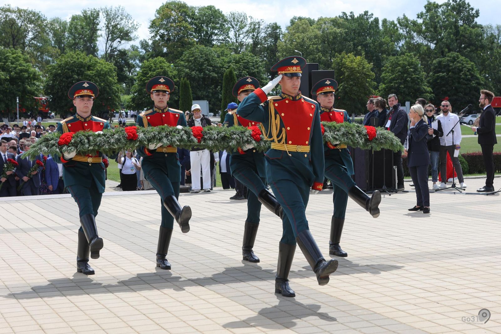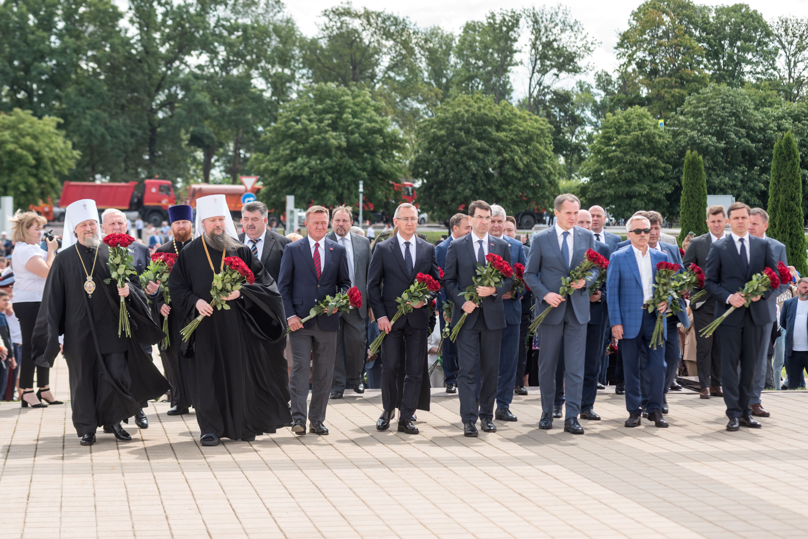 По завершении божественной литургии представители официальной делегации возложили цветы к памятнику патриарху Алексию II, который стоял у истоков создания при мемориальном комплексе «Прохоровское Поле» храма-музея святых апостолов Петра и Павла.