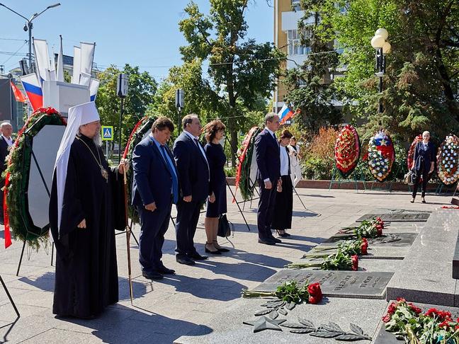 В полдень 22 июня собравшиеся горожане, сотрудники администрации области, региональных ведомств и предприятий, представители митрополии почтили память погибших в Великой Отечественной войне и возложили цветы и венки к мемориалу «Вечный огонь» на Соборной площади.