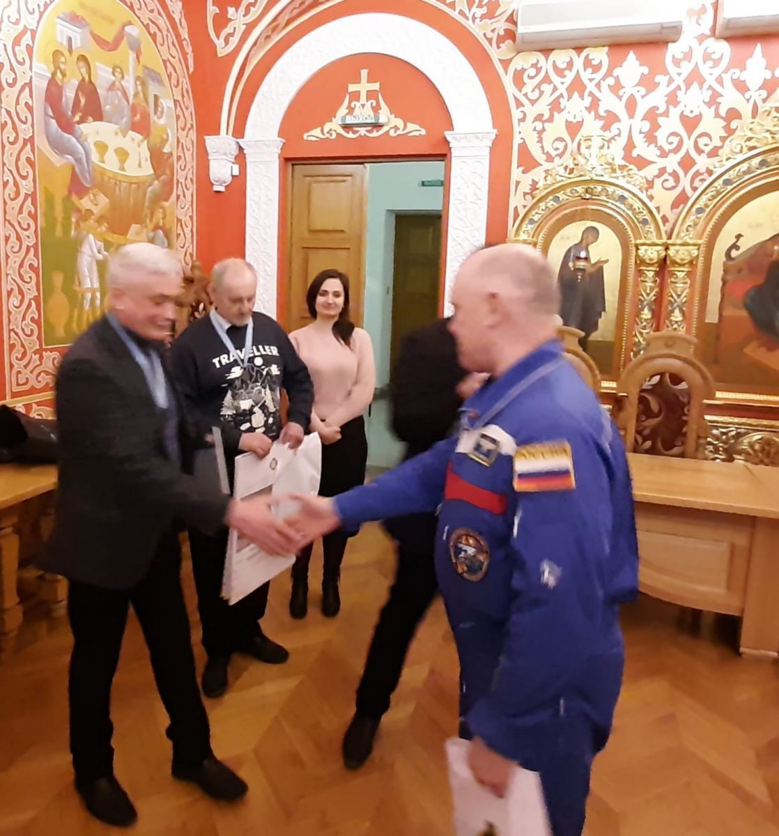 Членам Екатеринбургского отделения ИППО удалось пообщаться с почетными гостями до начала основной встречи. Заместитель руководителя Екатеринбургского отделения ИППО Алексей Селюков познакомил гостей с историей Императорского Православного Палестинского Общества, отметив, что у миссии ИППО и российского отряда космонавтов, особенно в просветительской сфере, много общего.