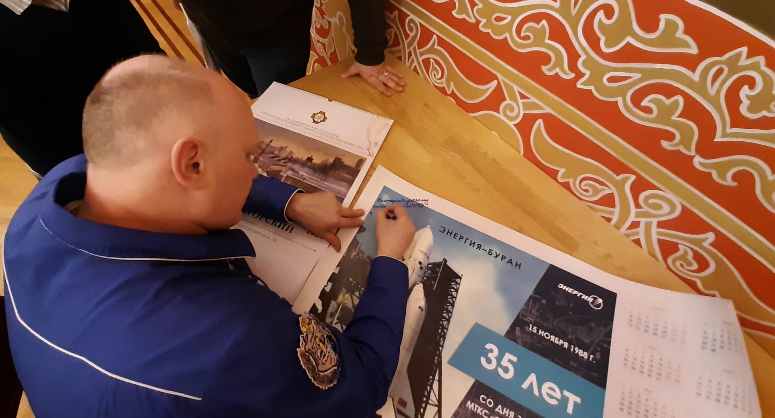 В свою очередь, Олег Артемьев подарил и оставил дарственную надпись на календаре, посвященном 35-летию со дня запуска МТКС «Энергия-Буран».