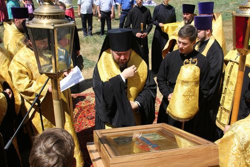 Далее водный крестный ход отправился в станицу Калитвенскую Каменского района, где торжества продолжились на побережье реки. К месту встречи святыни от стен калитвенского Успенского храма с иконами и хоругвями прошли жители станицы и её гости. Многочисленные верующие, около семисот человек, дождавшись прибытия иконы, вознесли молитвы перед святым крестителем Руси и поклонились образу. Молебное пение возглавил благочинный приходов Каменского округа иерей Владислав Касьянов. В молитве приняли участие и почётные гости – представители Администрации Каменского района, представители казачьих юртов во главе с атаманом Донецкого округа Н.Б. Кольжановым, представители Каменской районной Думы, глава сельского поселения С.В. Разуваев, представители Совета ветеранов, общественных организаций, средств массовой информации.