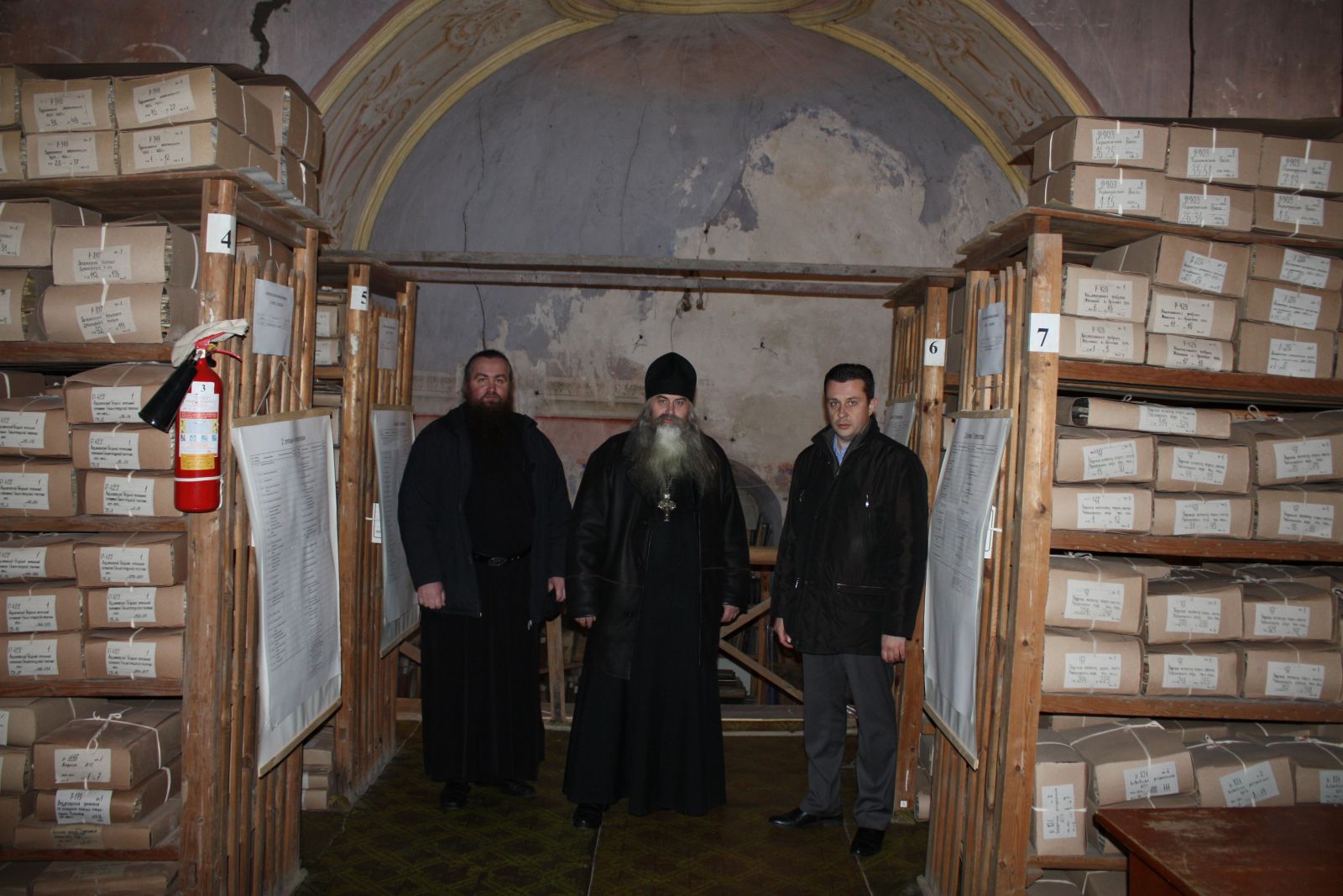 Благочинный обители, действительный член Нижегородского отделения ИППО иеромонах Феодосий (Какуркин) рассказал отцу Тихону и Александру Панину о ходе реставрационных работ, о том, как проходил процесс выезда с территории монастыря филиала архива. Также иеромонах Феодосий показал склеп, в котором был погребён Преосвященный Алексий и который был разграблен в советское время. После этого архимандритом Тихоном при участии братии монастыря была отслужена в Спасо-Преображенском соборе лития по владыке Алексию.