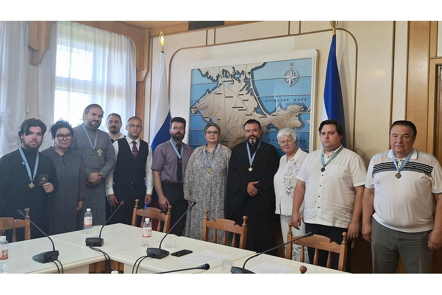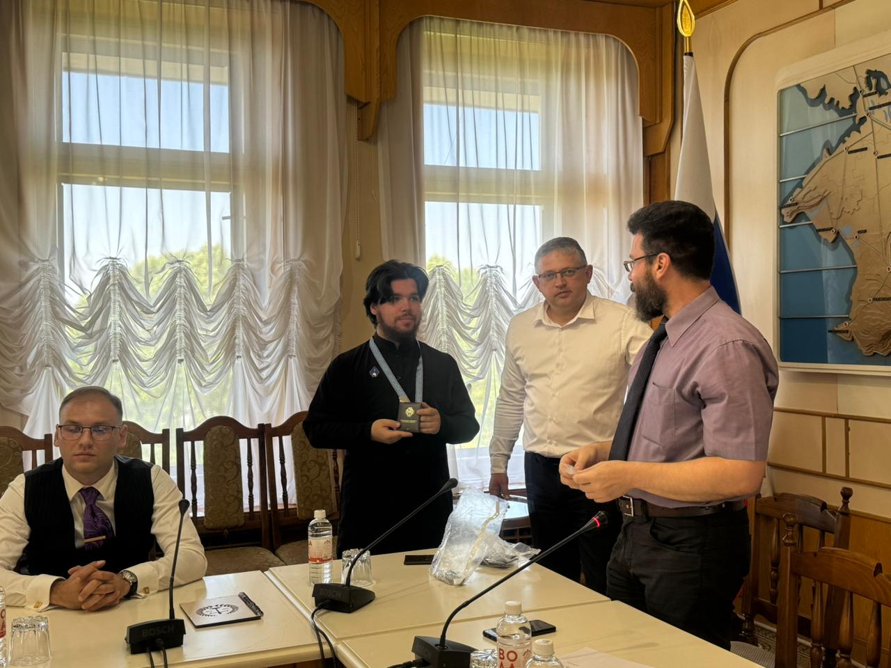 Руководитель Крымского отделения ИППО Роман Близняков и Председатель попечительского Совета, глава комитета Государственного Совета Республики Крым по патриотическому воспитанию и молодёжной политике Владимир Бобков торжественно вручили удостоверения и знаки отличия новым действительным членам ИППО – иерею Андрею Ермакову и выпускнику Таврической духовной семинарии Никите Полякову, пожелав им достойно нести высокое имя членов одной из старейших общественных организаций России.