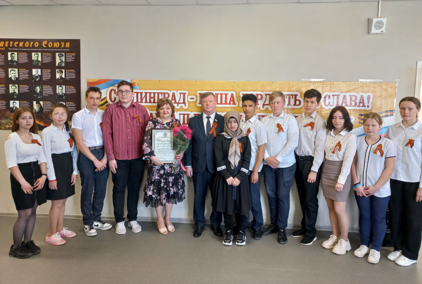 В свою очередь руководитель регионального отделения Общества Александр Брюханов на торжественном мероприятии, в канун великого праздника Дня Победы, подарил учащимся школы информационный стенд Герои Советского Союза – уроженцы Шадринского края.