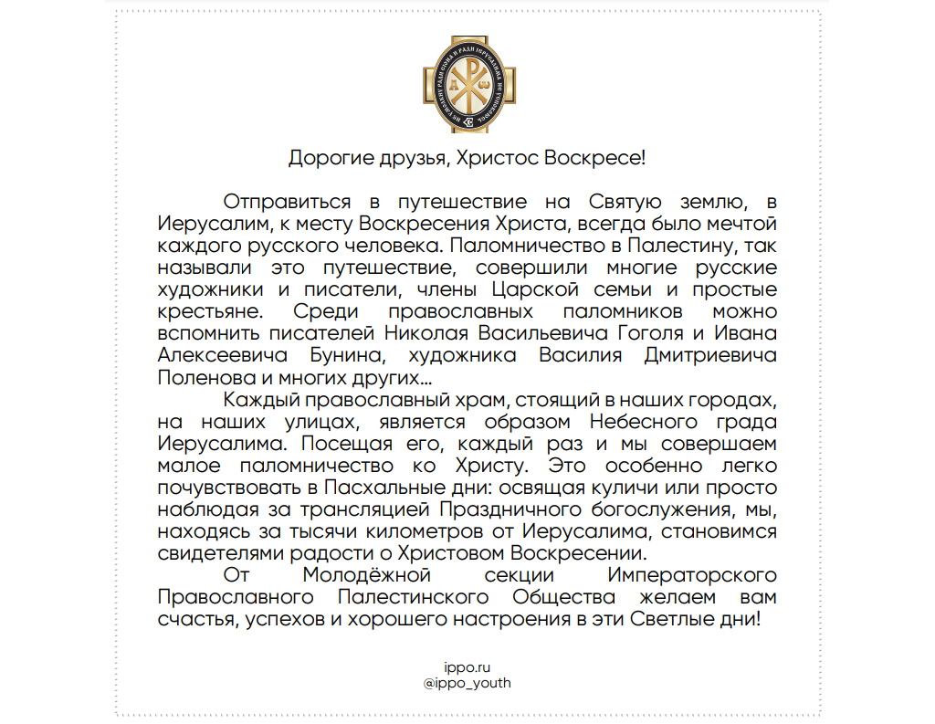 1 мая 2021 года члены Молодёжной секции Императорского Православного Палестинского Общества передали 140 освящённых пасхальных куличей и праздничные открытки детям из Центра содействия семейному воспитанию «Каховские ромашки».