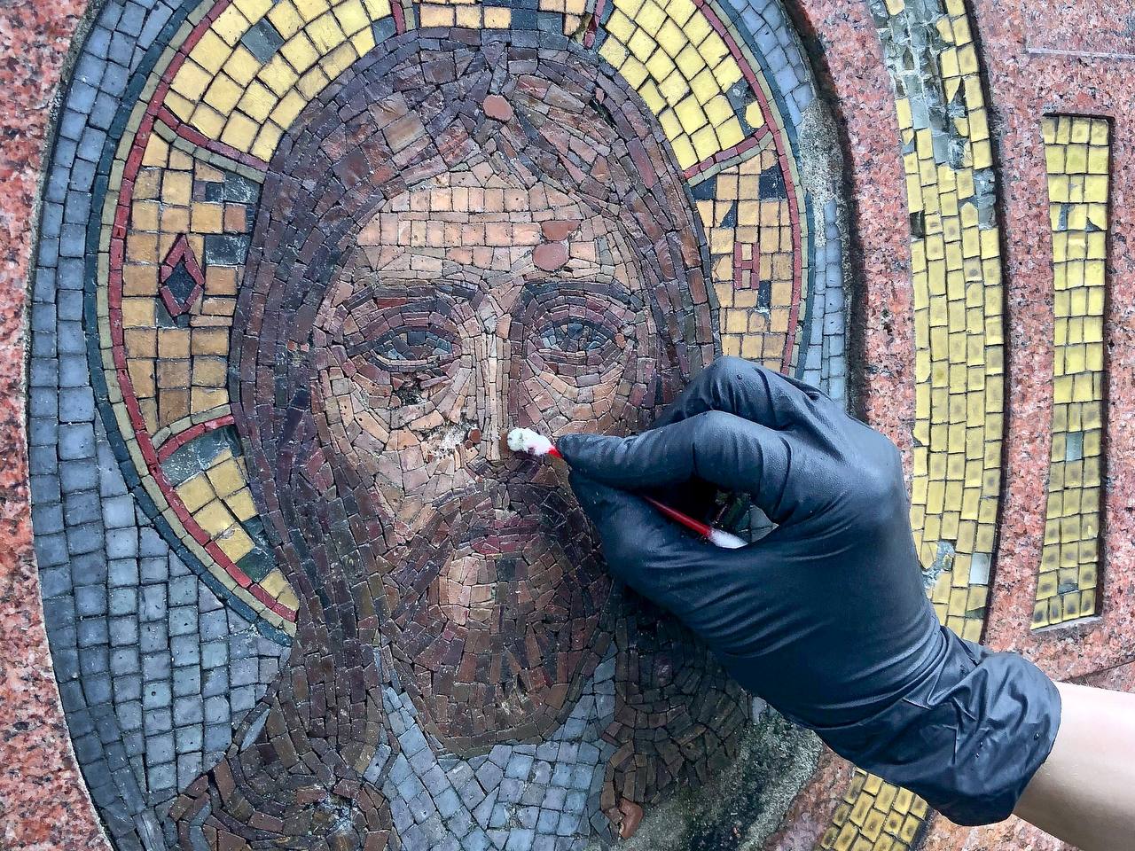 В процессе уборки мозаику Спасителя, состояние которой оказалось хуже, чем предполагалось, почистили. Осмотр проводила художник-реставратор, лауреат конкурса «Московская реставрация - 2021», ответственная за творческое направление деятельности Молодёжной секции ИППО Виктория Яковлева. Из-за неблагоприятных погодных условий и от времени, на мозаике произошла деструкция швов. Мозаика и мрамор покрыты мхом и плесенью. Была произведена первичная обработка раствором, проверено состояние смальты XIX века. В дальнейшем, для проведения реставрационных работ, необходимо будет изготовить максимально подходящую смальту.