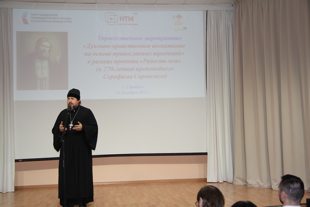 10 декабря 2024 года в актовом зале библиотеки имени А. С. Пушкина состоялось торжественное мероприятие «Духовно-нравственное воспитание на основе православных традиций» в рамках проекта к 270-летию преподобного Серафима Саровского «Радость моя», на которое были приглашены студенты Саранских вузов и духовной семинарии, школьники, представители государственных структур и общественных организаций.