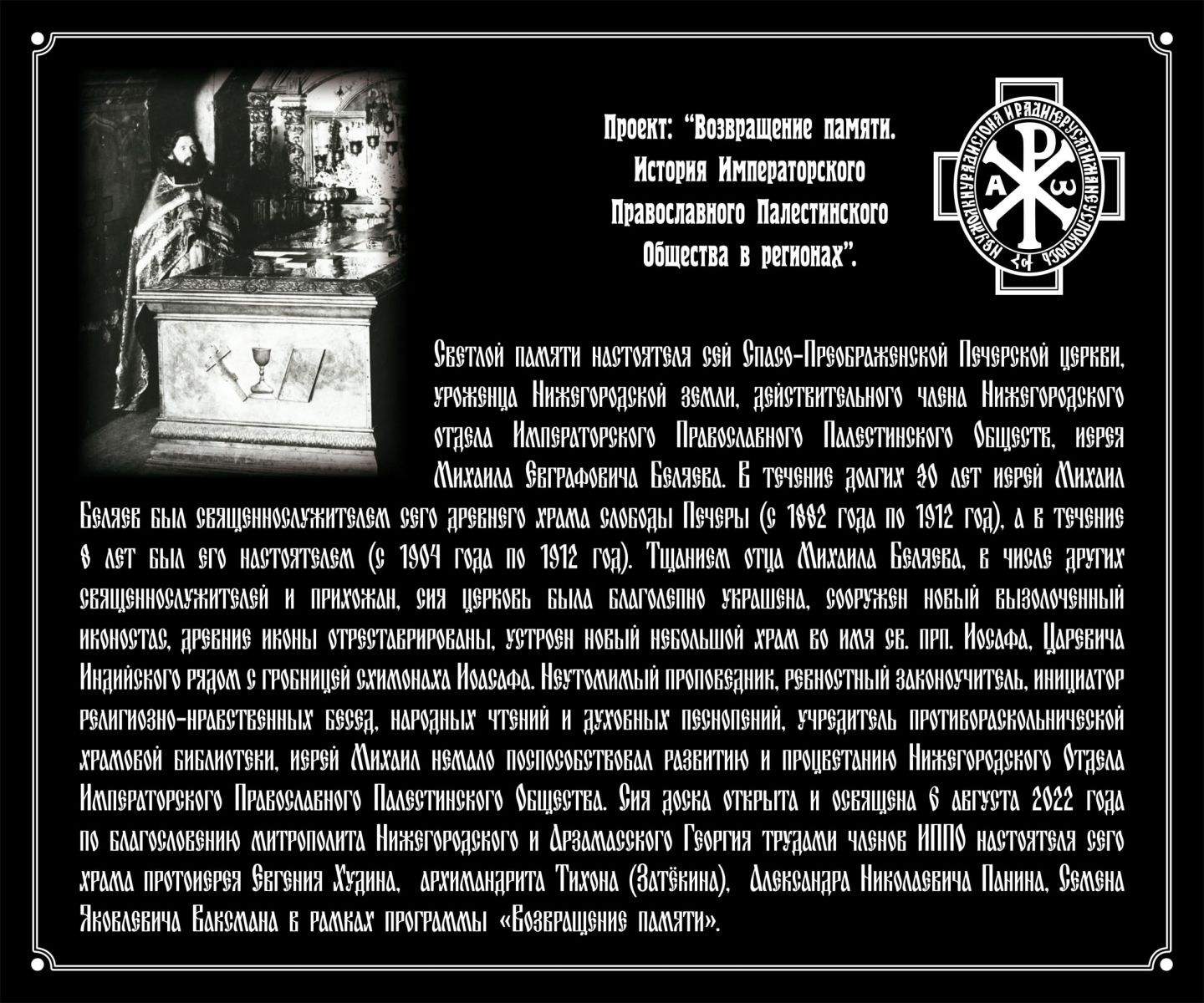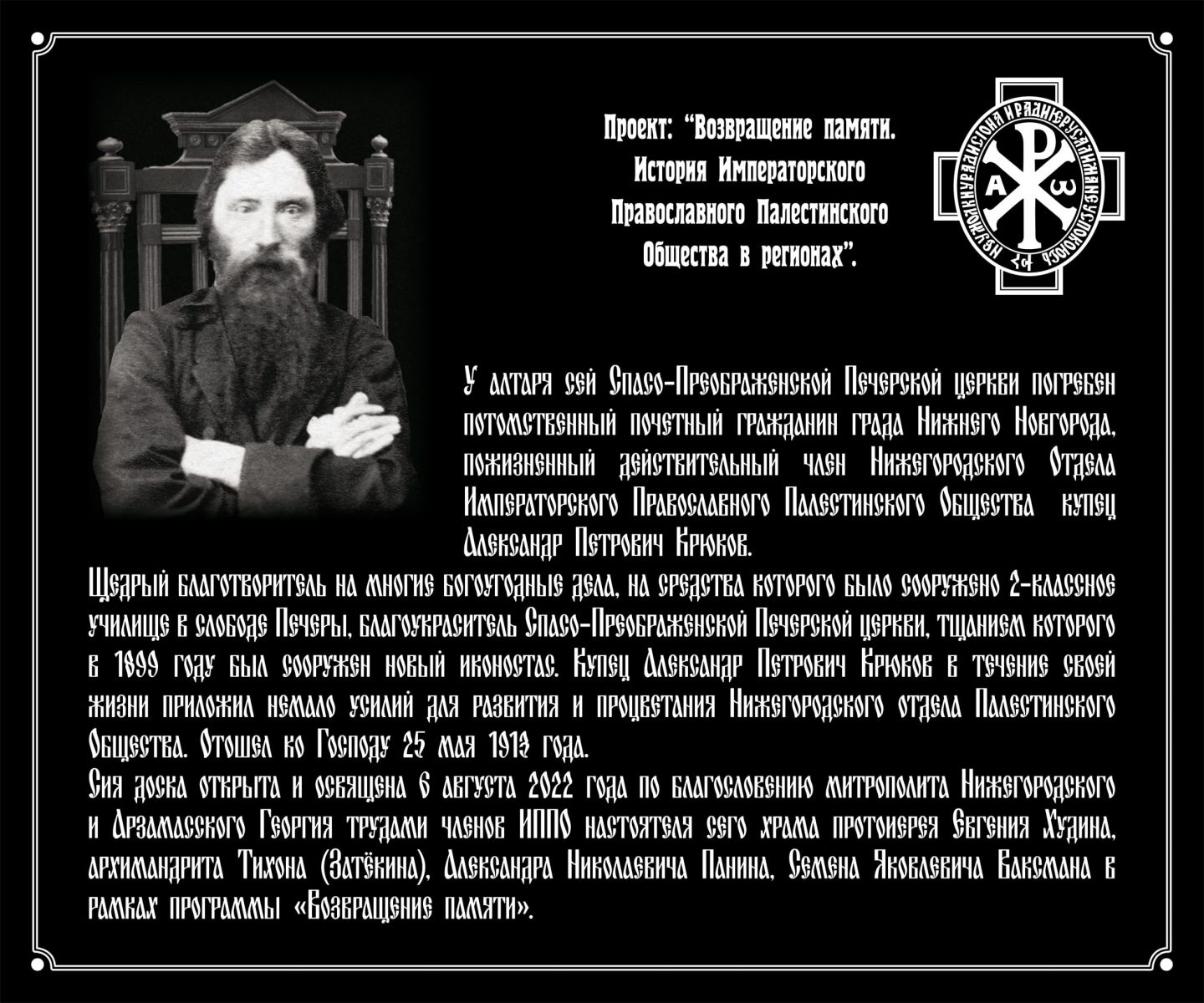 На данных досках увековечена память Нижегородского купца, пожизненного члена Нижегородского отделения ИППО Александра Крюкова и настоятеля сего храма, действительного члена Нижегородского отделения ИППО иерея Михаила Беляева.