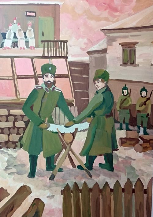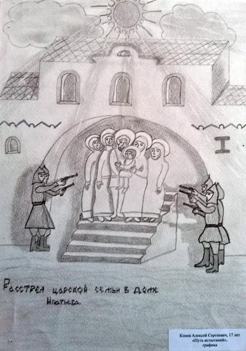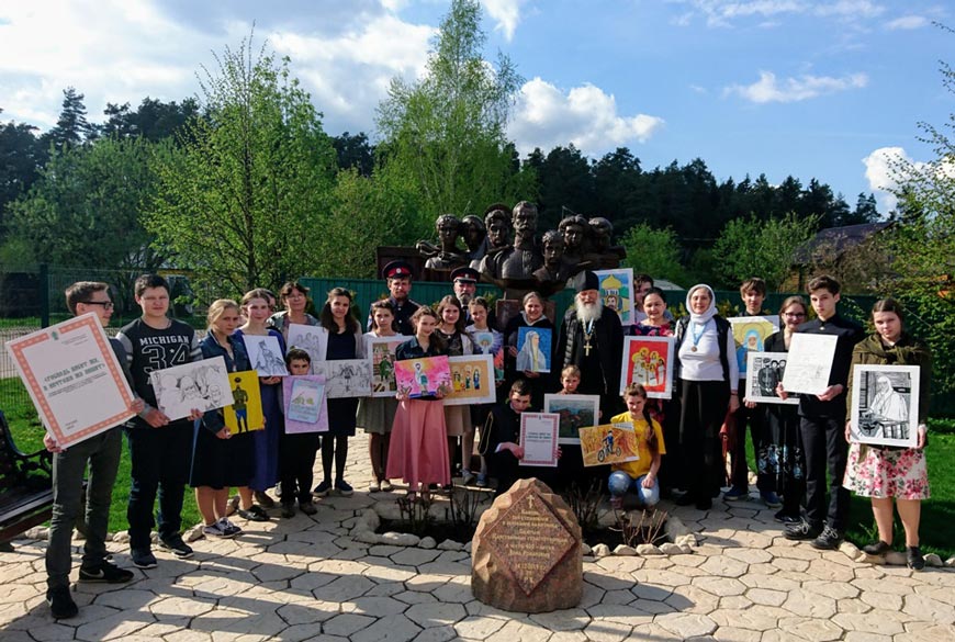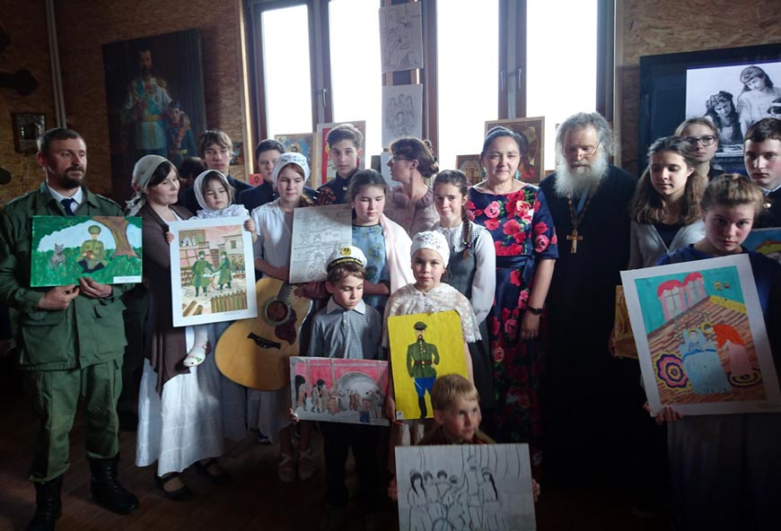 После праздничной трапезы и совместного фотографирования рядом с памятником святым царственным страстотерпцам все собрались в приходском доме, где учителем МХК Свято-Димитриевской школы Еленой Николаевной Семыкиной была представлена выставка детских работ, посвящённых святой царской семье. Эти работы были присланы участниками международного детского конкурса, посвящённого новомученикам российским.