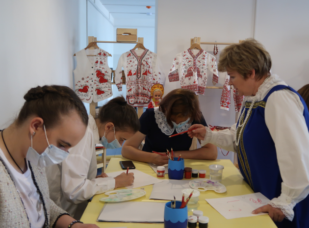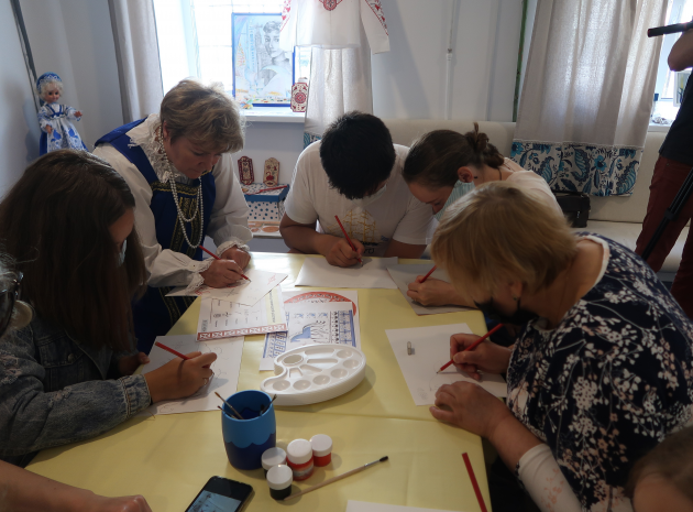 После выступления все отправились на мастер-класс по Мезенской росписи, который провела Екатерина Елисеева, одна из участниц хора. Уникальная роспись увлекла не только детей, но и взрослых. Спустя время чистые листы для работы преобразились, на них появились изображения – кони, завитки, веточки, птицы… Символы зверей, птиц, плодородия, урожая, огня, неба, других стихий идут ещё с наскальных рисунков и являются видом древнего письма, передающим традиции народов Севера России.