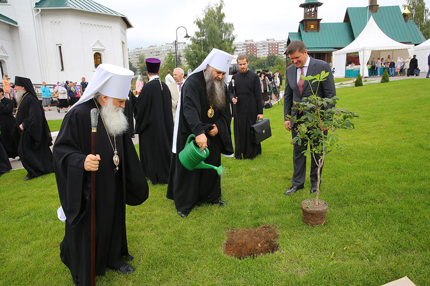 Далее архипастыри, духовенство и попечители заложили возле храма каштановую аллею и посетили медовую выставку-ярмарку. Сотрудники компании «Узорочье», одного из организаторов выставки-ярмарки, тоже поздравили владыку Георгия с Медовым Спасом и с юбилеем.