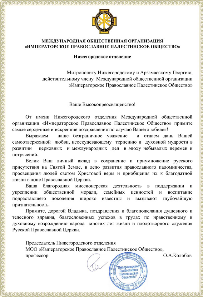 Руководитель Нижегородского отделения ИППО Олег Колобов направил поздравление митрополиту Георгию.