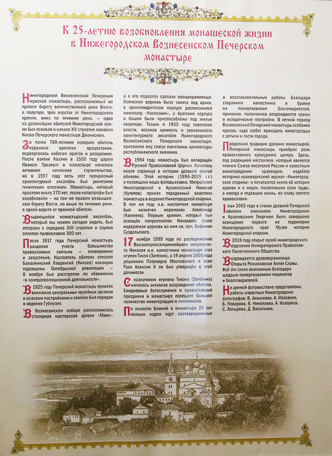 В начале встречи действительный член ИППО, ведущая вечера Ирина Вдовина-Судьина напомнила, что 25 лет назад на месте цветущей обители были поруганные храмы, осквернённое монастырское кладбище. В советские годы на территории монастыря располагались спичечная фабрика, кинотеатр «Колхозник», овощехранилище, стадион «Волгарь», Горьковские реставрационные мастерские, архив. Монастырь был возвращён Церкви в 1993 году. В начале 1994 года постановлением Священного Синода здесь была возобновлена монашеская жизнь. Первые заботы об обители принял на себя и.о. настоятеля иеромонах Александр (Каменев). В конце 1999 года в Нижний Новгород с Урала, из Верхотурья, по приглашению митрополита Нижегородского и Арзамасского Николая (Кутепова) приехал игумен Тихон (Затёкин). Он стал наместником обители.