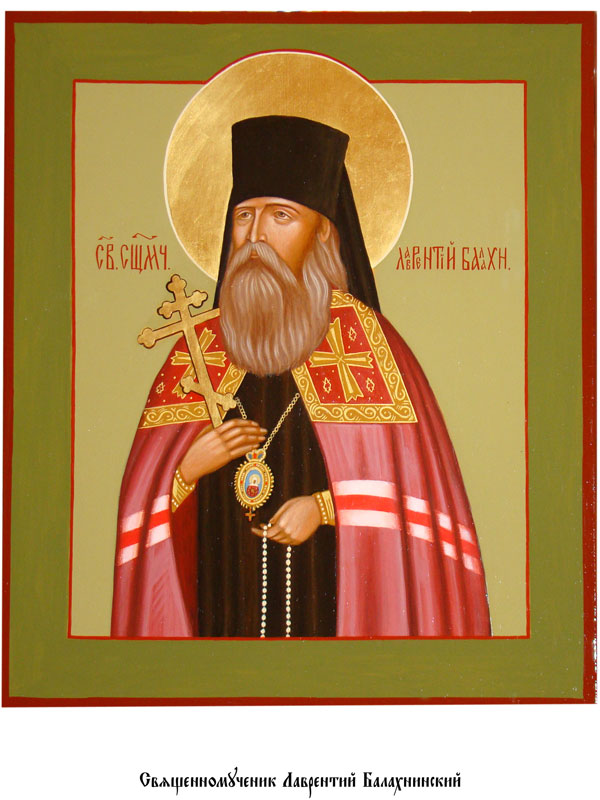 Священномученик Лаврентий, епископ Балахнинский (в миру Евгений Иванович Князев) родился в 1877 году в городе Кашире. Происходил он из духовного звания. Закончив Тульскую духовную семинарию, он продолжил обучение в Санкт-Петербургской духовной академии. После завершения обучения, в 1902 году, Евгений на Валааме был пострижен в монашество с именем Алексий. В 1912 году отец Александр назначается на должности ректора Литовской духовной семинарии и настоятеля Виленского Свято-Троицкого монастыря. Там он знакомится с архиепископом Тихоном, будущим Патриархом, который в 1917 году представил его к хиротонии. В феврале того же года архимандрит Лаврентий был хиротонисан во епископа Балахнинского, викария Нижегородской епархии. Владыка был усердным делателем Иисусовой молитвы, учеником и другом Оптинских старцев. Незадолго до его мученической кончины преподобный Анатолий (Зерцалов) трижды земно поклонился ему.