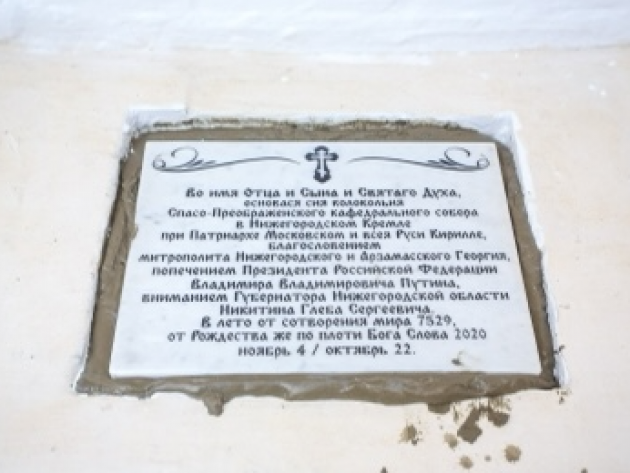 Перед церемонией высокопоставленные гости обратились к собравшимся с приветственными словами. Глава Нижегородской митрополии сказал: «Сегодня историческое событие — день памяти Казанской иконы Божией Матери, день победы русского воинства над иноземными захватчиками, День народного единства. Очень символично, что сегодня мы закладываем в основание колокольни грамоту с посланием будущим поколениям, таким образом поддерживая связь времен. Прежде всего, мы бы хотели, чтобы наши потомки заботились о процветании нашей Родины, хранили ее культурные и исторические традиции, ее духовное наследие, как когда-то его хранили и отстаивали наши предки, как хотим сохранить его мы — живущие сейчас. В праздник кремлевская звонница обретает голос. И сегодня он напоминает нам о том, как много веков назад на площади раздавался голос посадского старосты Кузьмы Минина с призывом «Купно за едино!» Храня память об этом, мы должны помнить, что залог для светлого будущего — в единстве и согласии, в заботе о своей земле, братской любви друг к другу, в вере к Господу. Только совместные труды помогут нам изменить жизнь на Нижегородской земле к лучшему, в том числе благоукрасить город к грядущему юбилею, и показать пример младшим поколениям, чего можно достичь, если совместно трудиться и направлять свои силы на созидание».