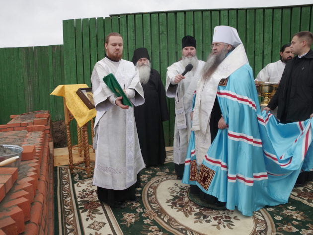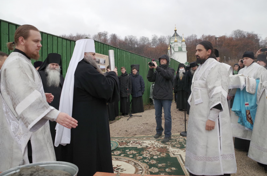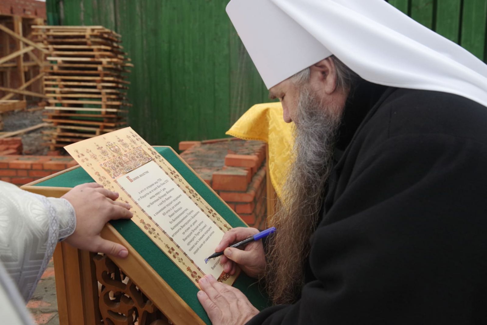 После подписания грамоты, ее поместили в особый приготовленный футляр и опустили в основание башни. Затем Его Высокопреосвященство совершил краткое молитвословие и окропил возводимые стены северной башни святой водой, после чего Владыка митрополит, архимандрит Тихон (Затёкин) и вся присутствующая братия заложила капсулу раствором, положив поверх него кирпичи.