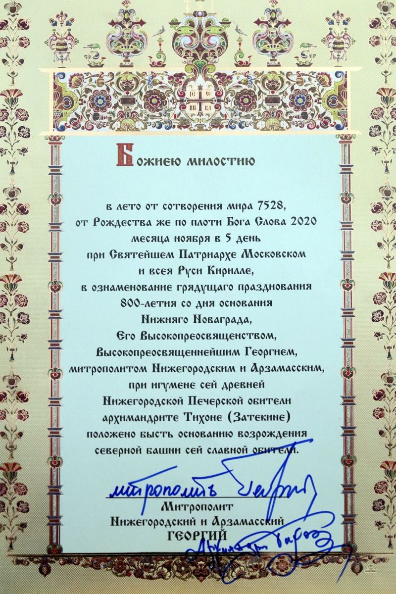 После обращения, Его Высокопреосвященство подписал закладную грамоту: в которой говорится: " Божиею милостию в лето от сотворения мира 7528, от Рождества же по плоти Бога Слова 2020 месяца ноября в 5 день при Святейшем Патриархе Московском и всея Руси Кирилле, в ознаменование грядущаго празднования 800-летия со дня основания Нижняго Нова Града, Его Высокопреосвященством, Высокопреосвященнейшим Георгием, митрополитом Нижегородским и Арзамасским при игумене сей древней Нижегородской Печерской обители архимандрите Тихоне (Затёкине) положено бысть основанию возрождения северной башни сей славной обители".