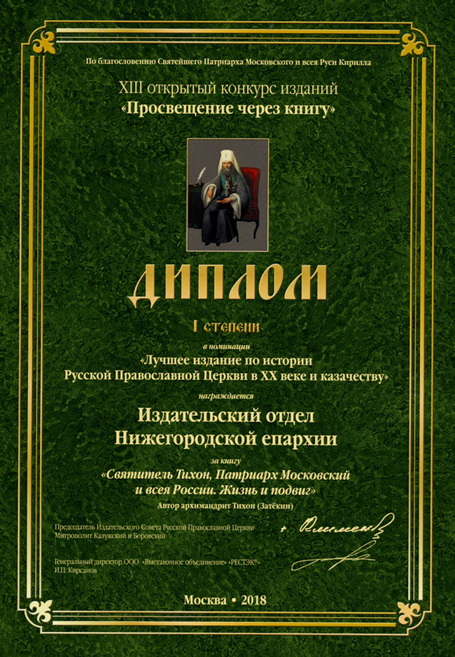 Игумен Вознесенского Печерского монастыря, заместитель руководителя Нижегородского отделения ИППО архимандрит Тихон (Затёкин) и возглавляемый им Издательский отдел Нижегородской епархии при Печерском монастыре заняли первое место в номинации «Лучшее издание по истории Русской Православной Церкви в ХХ веке и казачеству» за книгу «Святитель Тихон, Патриарх Московский и всея России. Жизнь и подвиг». Наместник Далматовского Успенского монастыря Шадринской епархии, действительный член Нижегородского отделения ИППО игумен Варнава (Аверьянов) занял второе место за книгу «Стопами отца Антонина: от Батурино до Перми. Путешествия и приключения семинариста Андрея Капустина во время его жительства в Сибири (1817–1836 гг.)».