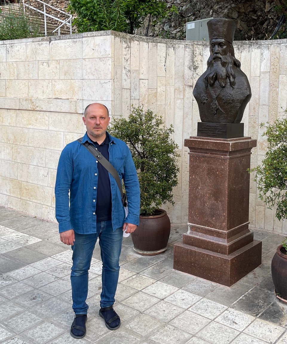Руководитель Представительства ИППО Денис Судобин в Горненском Монастыре возле бюста Архимандрита Антонина Капустина