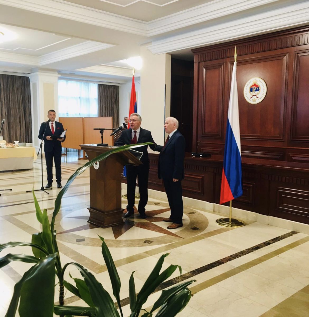 Посол России в БиГ И.А.Калабухов наградил нагрудным знаком «За отличие» МИД России ветерана дипломатической службы, действительного члена ИППО А.А. Шинкарева. Также медалью Пушкина был награжден действительный член ИППО Ж. Чеич.