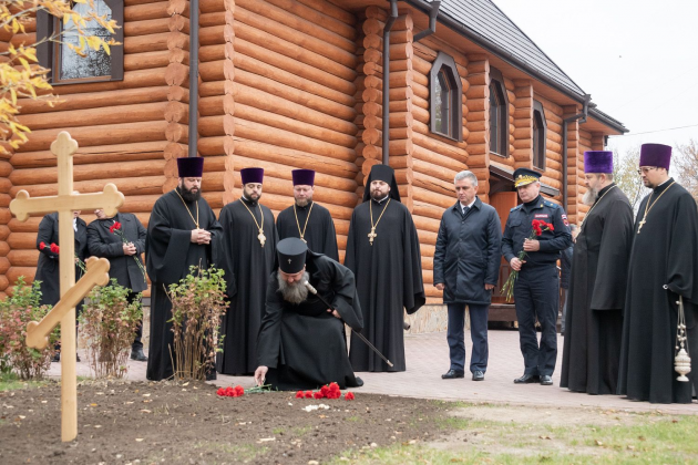 По окончании богослужения участники траурной церемонии возложили цветы к братской могиле, а также на могилу, в которой покоятся нетленные останки одного из тех, кто был расстрелян осенью 1938 года и перезахоронен 10 октября нынешнего года у стен храма новомучеников и исповедников Церкви Русской. В память о погибших в храме были зажжены поминальные свечи.