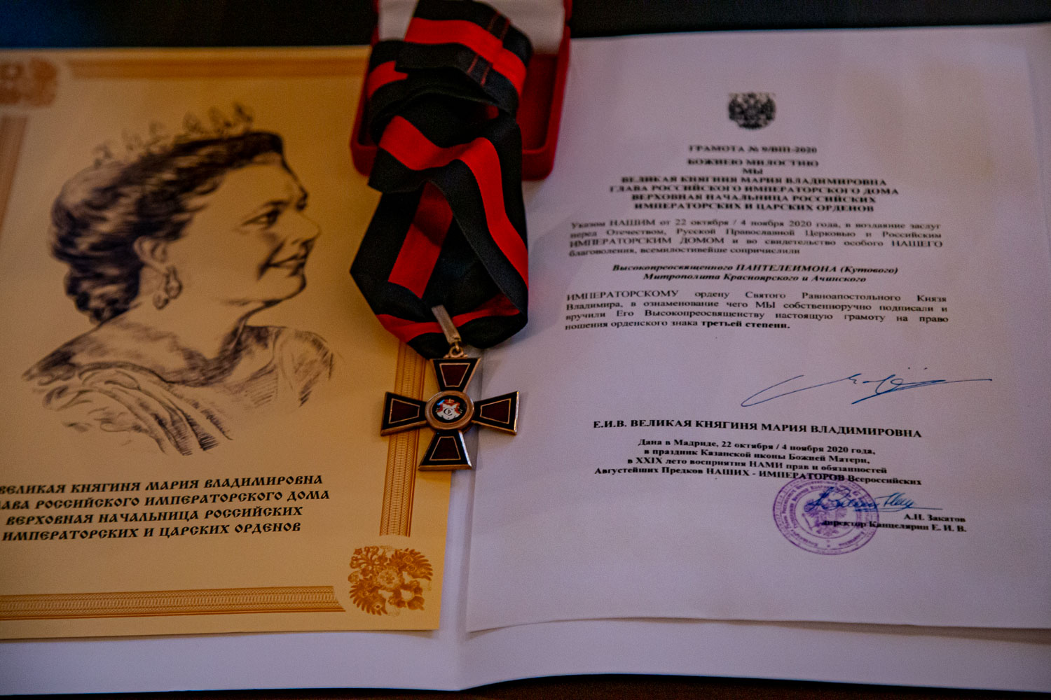 Затем руководитель Красноярского отделения ИППО, председатель Военного Дворянства в Красноярском крае Сергей Гонюхов вручил Владыке от имени Главы Российского Императорского Дома Ее Императорского Высочества Государыни Великой Княгини Марии Владимировне Императорский Орден Святого Равноапостольного Великого Князя Владимира 3-й степени.