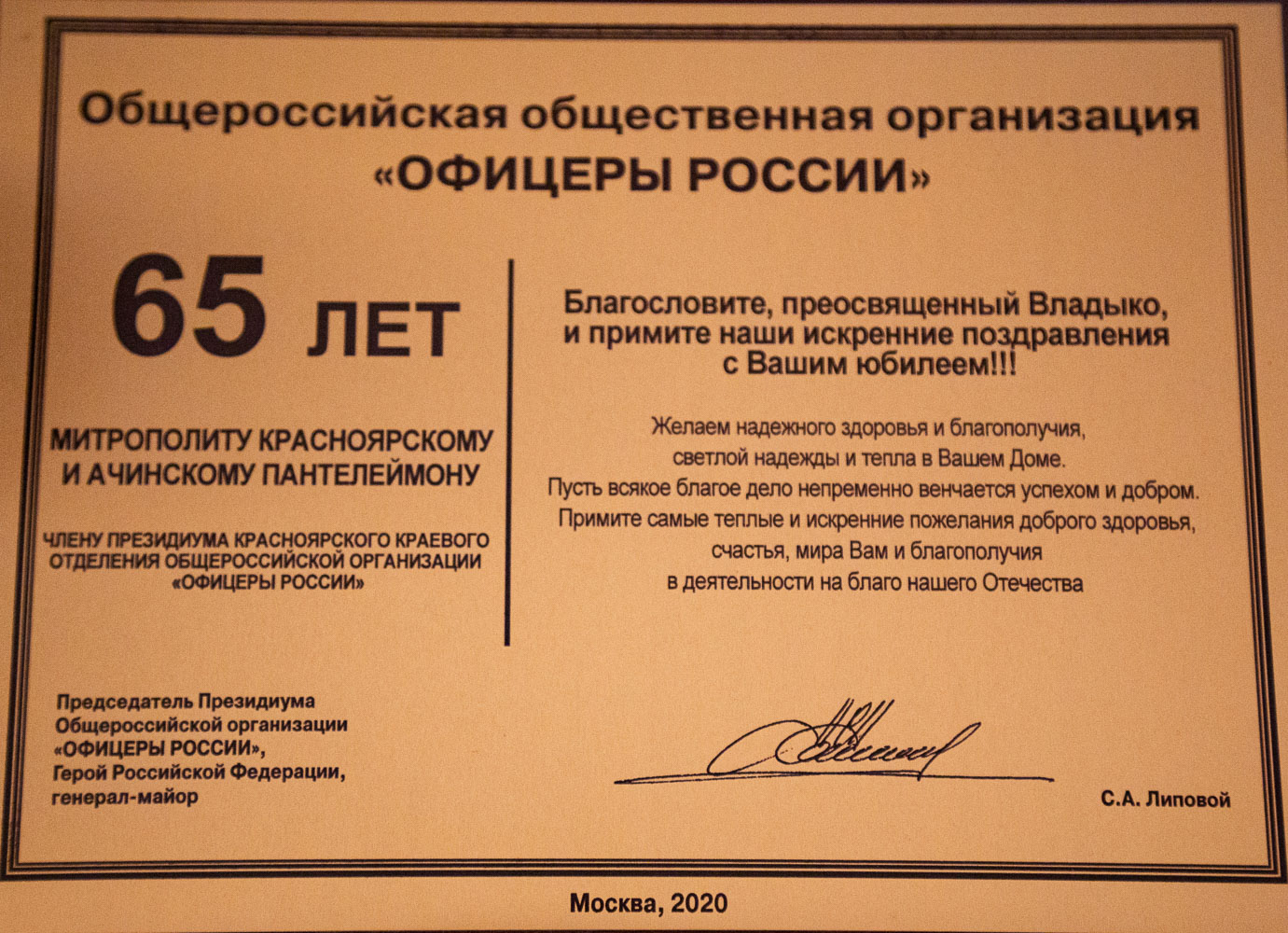 Также митрополиту Красноярскому и Ачинскому Пантелеимону был вручен юбилейный памятный адрес от Общероссийской организации «Офицеры России» за подписью председателя Президиума героя России, генерал майора Сергея Липового.