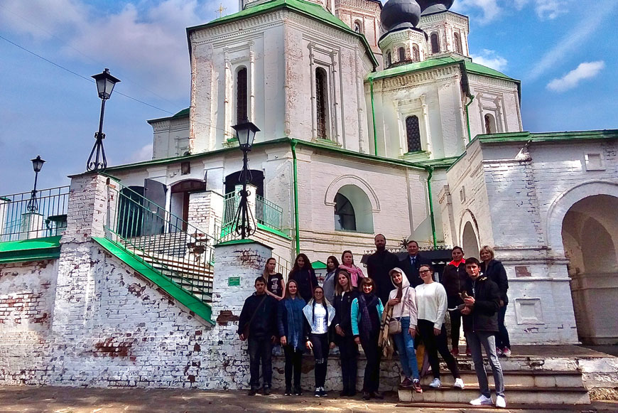 Затем группа направилась к Воскресенскому войсковому собору – каменному девятиглавому храму 46-метровой высоты, сооружённому в стиле южнорусского барокко. У стен древнейшего храма Дона студенты услышали интересную историю легендарного места – сбора Войскового круга, мемориального памятника истории казачества, где принимались решения о военных походах и начиналось Смутное время Степана Разина, где атаманом был избран станичник-бунтарь Кондратий Булавин, а в 1696 году был произведён первый в России воинский салют и фейерверк в честь взятия турецкого Азова.