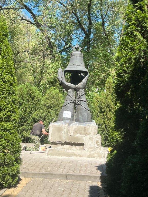 Автор памятника героям-чернобыльцам Сергей Исаков – заслуженный художник РФ, Академик Российской академии художеств, действительный член Императорского Палестинского Православного Общества. Бронзовый памятник высотой около пяти метров изображает руки, протянутые к небу и держащие колокол, который звонит по погибшим ликвидаторам. Молекула атома символично сковала эти руки.