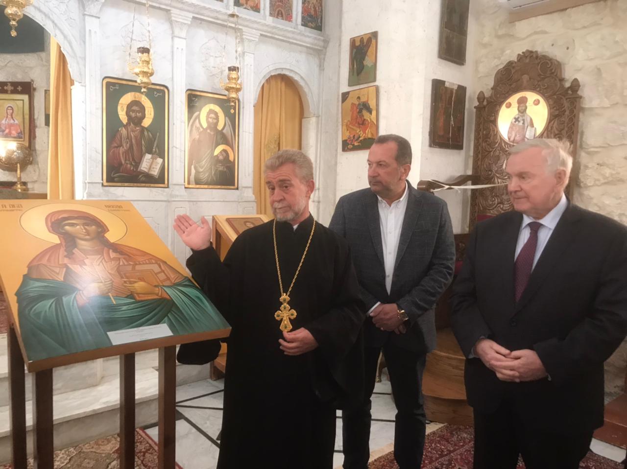 В рамках визита заместитель руководителя Международной секции ИППО, президент Фонда «РУССАР» Олег Фомин и руководитель Сирийского отделения ИППО Мишель Аль-Тали передали в дар обители написанную палехскими мастерами икону святой Феклы.