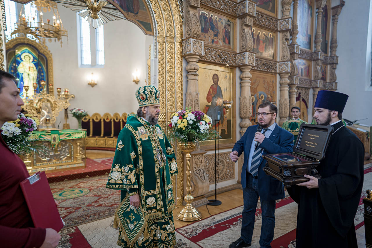 Гости из Северной столицы - руководитель Союза православных предпринимателей Владислав Жукович и директор фонда «Священное наследие» Михаил Артеев вручили в дар Митрополиту реликвию - частицу Покрова Пресвятой Богородицы.