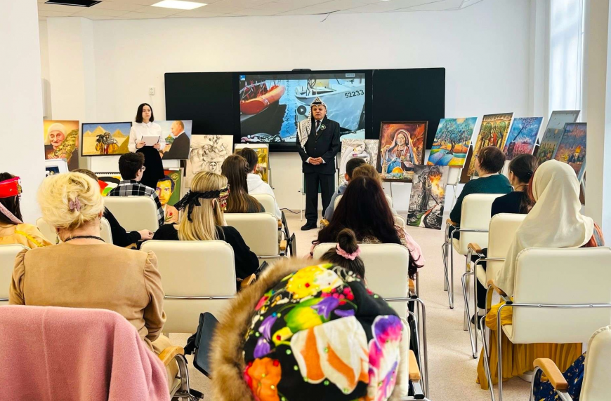 Затем с приветственным словом к участникам церемонии открытия обратилась учитель изобразительного искусства и черчения Наталья Петрова. Она также вручила руководителю регионального отделения Общества свою работу.
