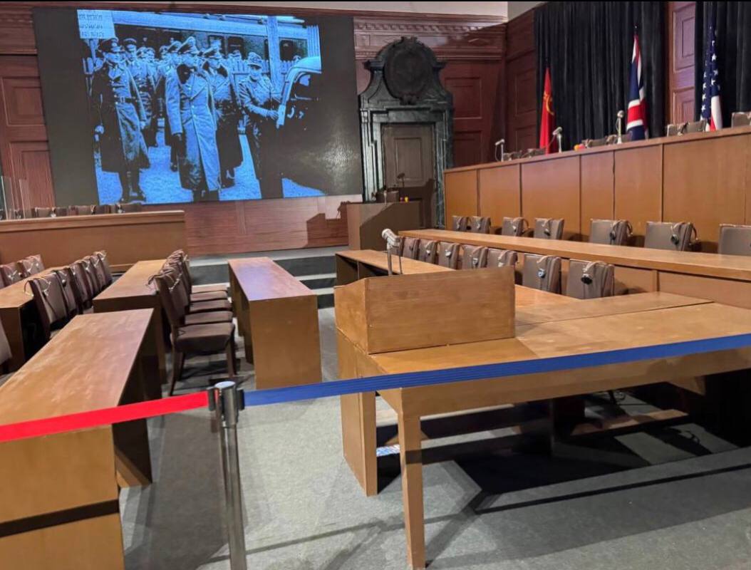 В рамках экспозиции представлена реконструкция зала № 600 Нюрнбергского дворца правосудия, где проходили процессы над военными преступниками.