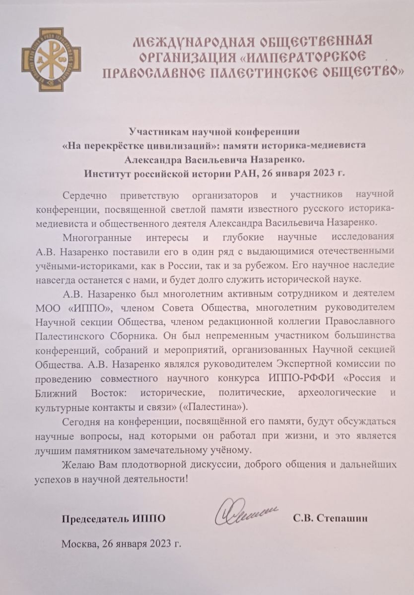 Председатель ИППО Сергей Степашин в своём приветствии отметил, в частности, следующее: «Многогранные интересы и глубокие научные исследования А.В. Назаренко поставили его в один ряд с выдающимися отечественными учёными-историками, как в России, так и за рубежом. Его научное наследие навсегда останется с нами, и будет долго служить исторической науке. А.В. Назаренко был многолетним активным сотрудником и деятелем МОО «ИППО», членом Совета Общества, многолетним руководителем Научной секции Общества, членом редакционной коллегии Православного Палестинского Сборника. Он был непременным участником большинства конференций, собраний и мероприятий, организованных Научной секцией Общества. А.В. Назаренко являлся руководителем Экспертной комиссии по проведению совместного научного конкурса ИППО-РФФИ «Россия и Ближний Восток: исторические, политические, археологические и культурные контакты и связи» («Палестина»). Сегодня на конференции, посвящённой его памяти, будут обсуждаться научные вопросы, над которыми он работал при жизни, и это является лучшим памятником замечательному учёному».