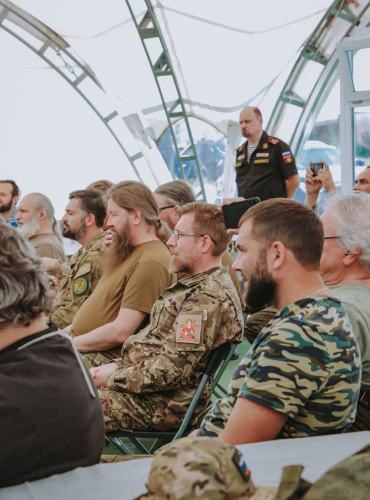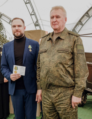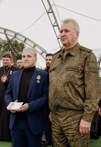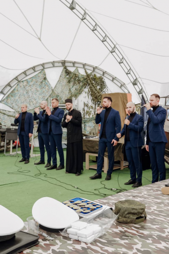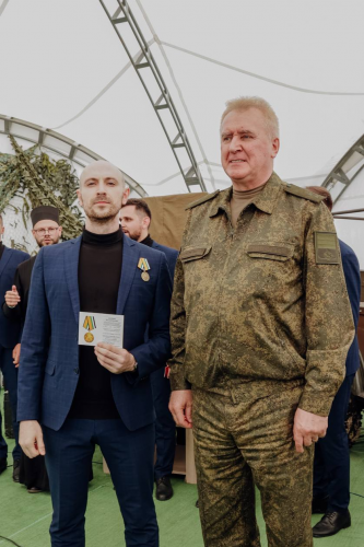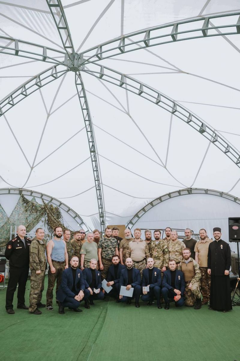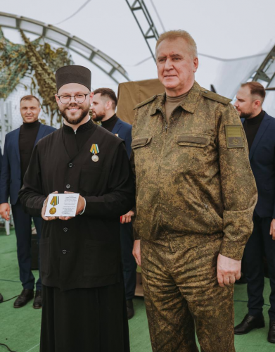 После концертного выступления на полигоне, где проходит подготовку духовенство, направляющееся в зону СВО, генерал-лейтенант Олег Веселков, начальник управления по взаимодействию с религиозными объединениями Главного военно-политического управления ВС РФ, возглавил церемонию награждения.