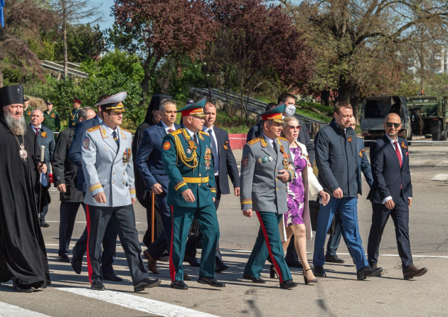 По уже сложившейся традиции состоялась церемония поднятия Знамени Победы – копии штурмового флага 150-й Идрицкой стрелковой дивизии, водруженного вечером 30 апреля (1 мая по московскому времени) 1945 года на здание Рейхстага в Берлине. Полотно, переданное приднестровцам россиянами в мае 2014 года, поднялось в мирное тираспольское небо под звуки советского гимна, исполненного оркестром Главного штаба Минобороны ПМР.