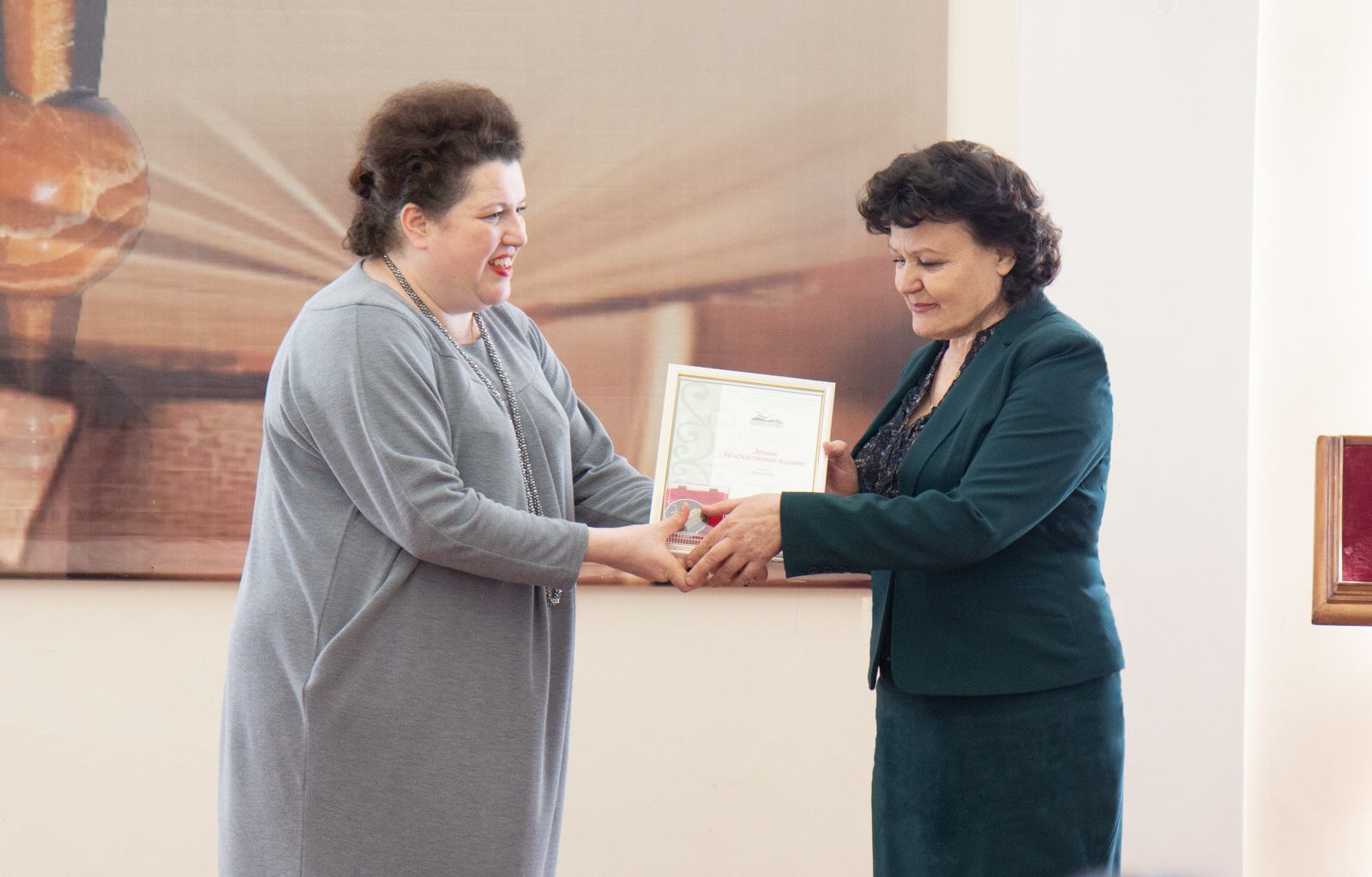Награду победителя книжного фестиваля-конкурса «Симбирская книга» Ольге Шейпак вручила и.о. министра искусства и культурной политики Ульяновской области Евгения Сидорова.