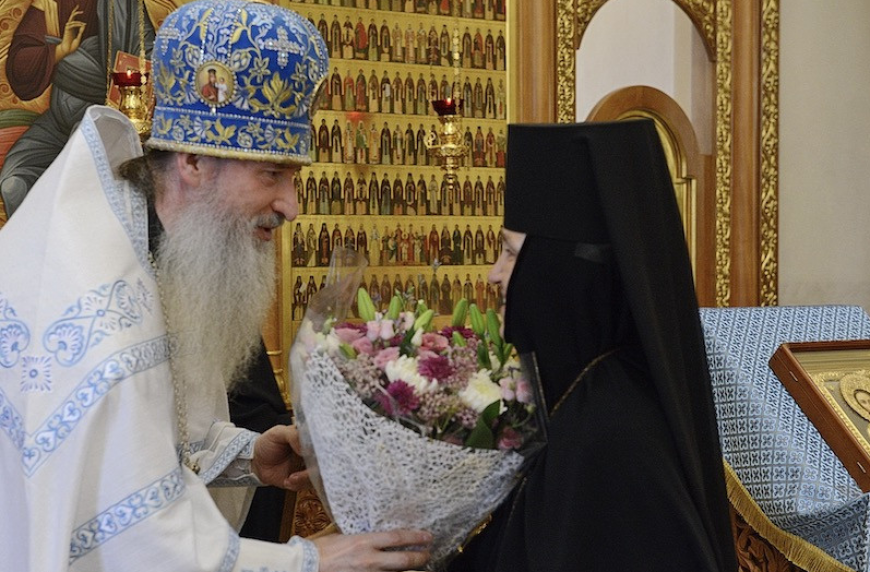 После отпуста Божественной литургии в честь игумении Екатерины было возглашено многолетие, затем Начальник Миссии обратился к матушке со словами поздравления, пожелав ей неоскудевающей помощи Божией в несении непростого послушания вдали о Родины, и преподнес ей букет цветов.