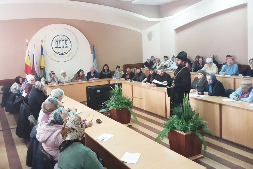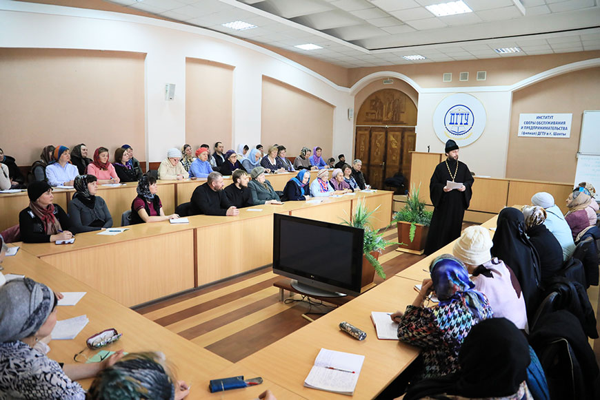 Обучение приходских сотрудников организовали и провели отдел религиозного образования и катехизации, епархиальное управление и кафедра православной культуры и теологии Института сферы обслуживания и предпринимательства (филиала) ДГТУ в г. Шахты в помещении зала заседаний учёного совета вуза.