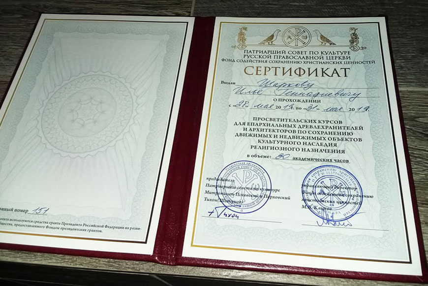 По окончании курсов председатель Экспертного совета по церковному искусству, архитектуре и реставрации, член Патриаршего совета по культуре, древлехранитель Московской городской епархии протоиерей Леонид Калинин и руководитель отдела культурного наследия Патриаршего совета по культуре Светлана Анохина вручили cлушателям свидетельства о повышении квалификации.