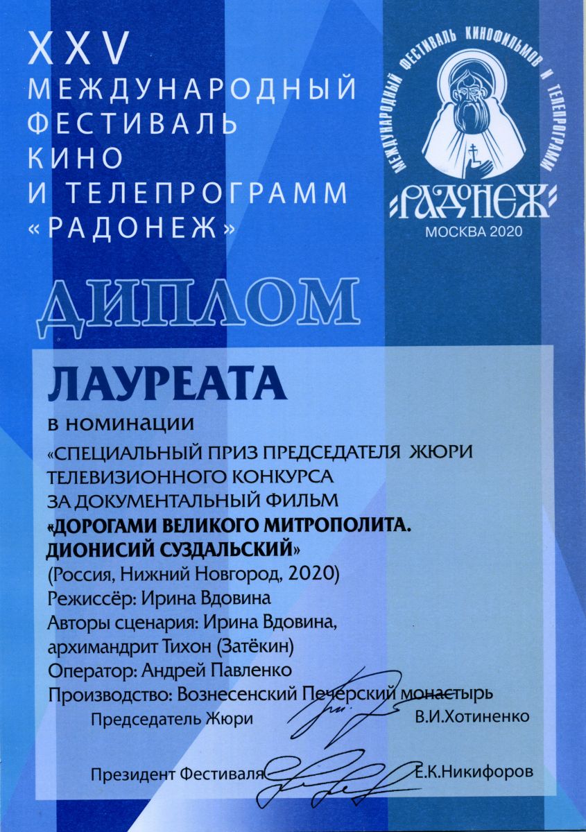 27 ноября 2020 года в Доме Кино один из крупнейших форумов кинематографистов, работающих над религиозными и нравственными темами, подвел итоги. Фестиваль проводится по благословению Святейшего Патриарха Московского и всея Руси Кирилла в Москве в Доме кино Союза кинематографистов РФ при поддержке Министерства культуры РФ, Министерства связи и массовых коммуникаций, Федерального агентства по кинематографии, Правительства Москвы, Союза кинематографистов России, Синодального информационного отдела, Синодального отдела по связям Церкви и общества, Патриаршего Совета по культуре и ОВЦС. Фестиваль «Радонеж» проводится регулярно с 1995 года. В нем традиционно принимают участие около 200 государственных и негосударственных кино- и телерадиокомпаний со всего православного мира.