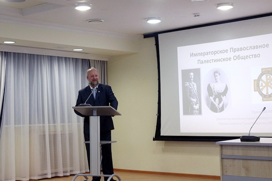 Директор Музея истории Императорского Православного Палестинского общества Григорий Маневич огласил приветствие Председателя ИППО С.В. Степашина в адрес участников конференции и представил собравшимся познавательный рассказ с историческим экскурсом, сопровожденный слайдами с иллюстрациями, о деятельности Императорского Православного Палестинского Общества на Святой Земле и других государствах Ближнего Востока в разные исторические эпохи и в современное время.