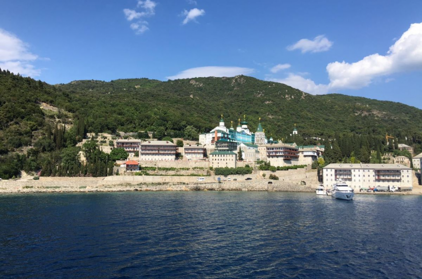 Монастырь св. Пантелеимона расположен на берегу небольшой бухты на юго-западе Афонской горы между пристанью Дафни и монастырем Ксенофонт.