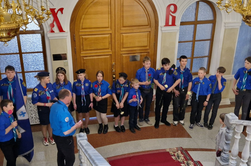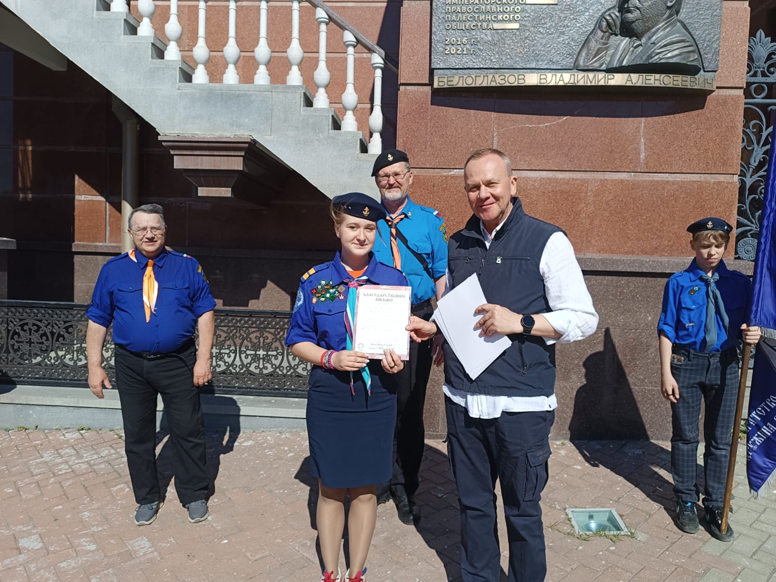 После возложения цветов юные следопыты торжественно открыли морскую практику и летний сезон походов. Был вынесен флаг, прозвучали добрые напутственные слова у барельефа Владимиру Белоглазову, возродившему работу Императорского Православного Палестинского Общества в 2016 году в Екатеринбурге.