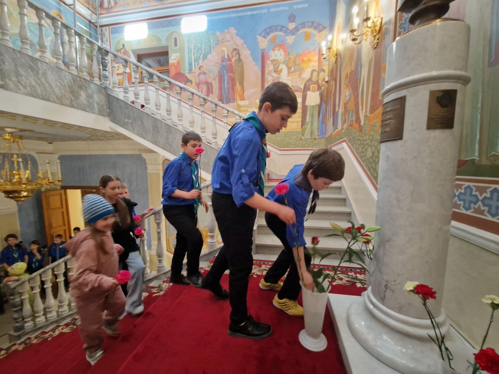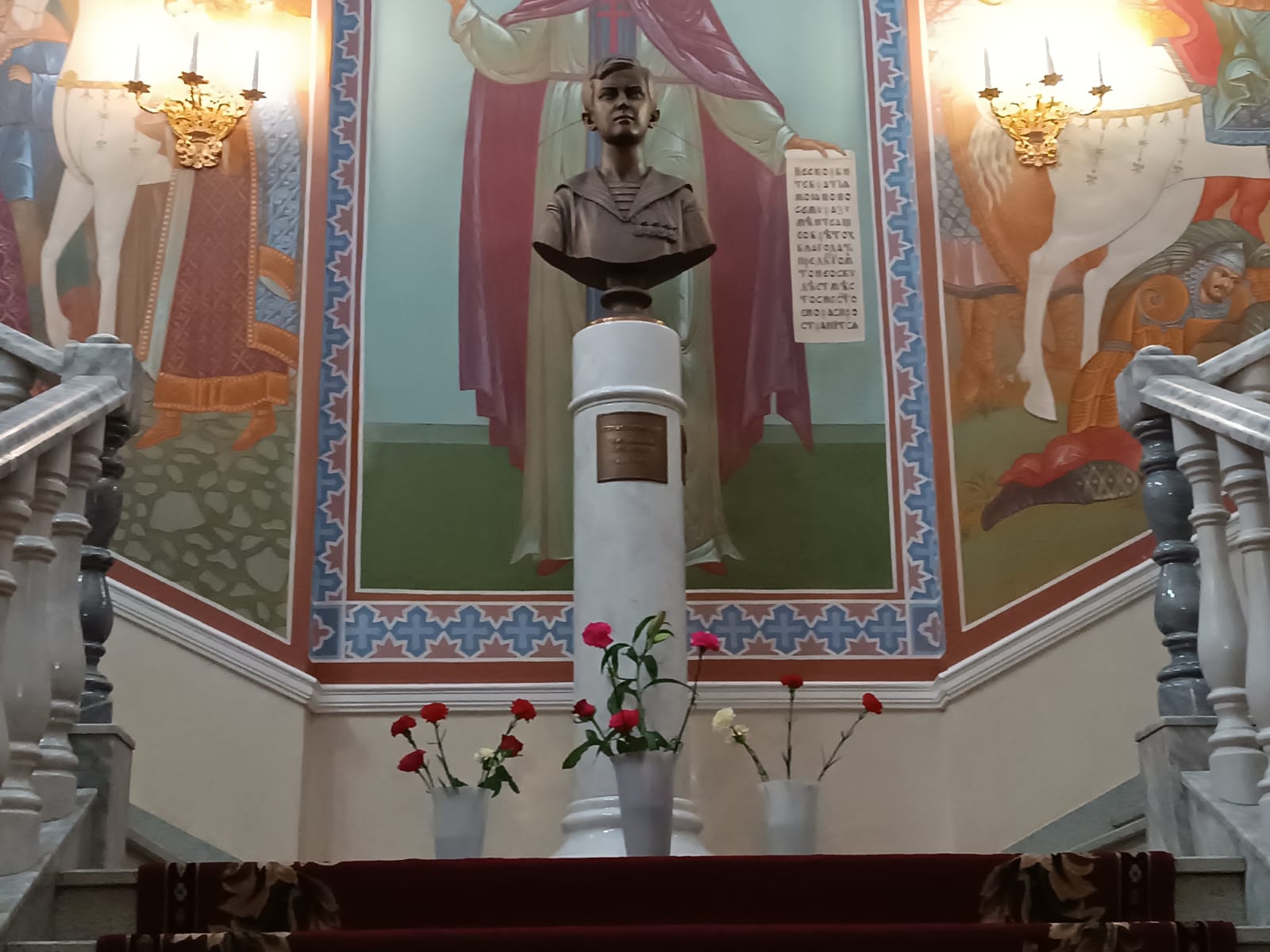 После молебна ребята продолжили традицию возложения цветов к бюсту святого страстотерпца цесаревича Алексия в культурно-просветительском центре «Царский».