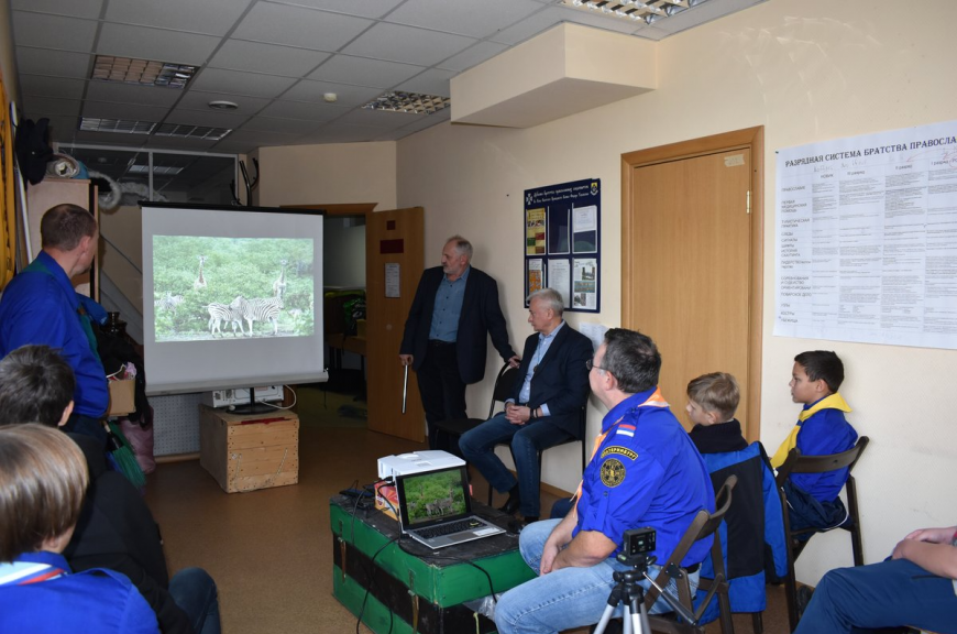 Встреча была посвящена безопасности в условиях дикой местности, туристического похода и отдыха на природе. Николай Антонович поделился своим опытом с молодыми православными следопытами о его участии в экспедиции по югу Африки.