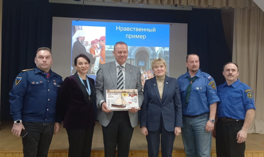 Заместитель руководителя Екатеринбургского отделения ИППО Алексей Селюков вручил сборный макет ботика в масштабе 1:24 действительному члену ИППО, руководителю регионального центра патриотического воспитания «Каравелла» Ларисе Крапивиной.